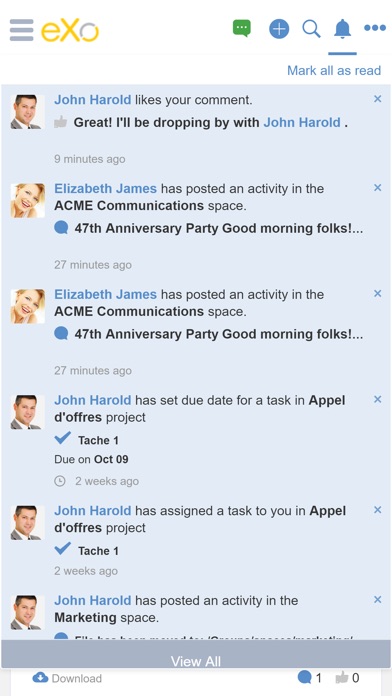 The eXo mobile app connects to your organization’s private and personalized installation of eXo Platform. eXo Platform allows enterprises to set up a ready-to-use collaborative intranet, extranet, enterprise social network or knowledge management system.