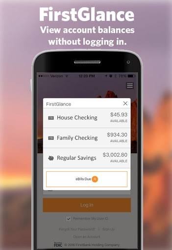 • FirstGlance: Spin the cube! Quickly view balances and eBills due without logging in. Simply enroll and set up the accounts you would like to view (up to 3) by selecting “FirstGlance” within the main menu. After enrolled, spin the FirstBank cube before login to access FirstGlance.