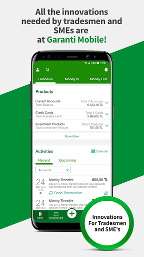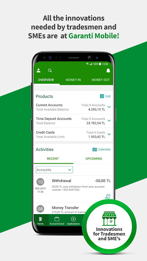 The management of your financials is on your mobile phone with Garanti BBVA Mobile! With the mobile banking application that enables personal and corporate customers as well as the SMEs to easily perform all their banking transactions anywhere they want, you can perform your money transfers and bill or tax payments, view the progress of your assets from past to present, track your income and expenditures, view your future cycle expenditures on the calendar, and perform many other banking transactions instantly. Moreover, you may also apply for the general purpose loan and disburse it.