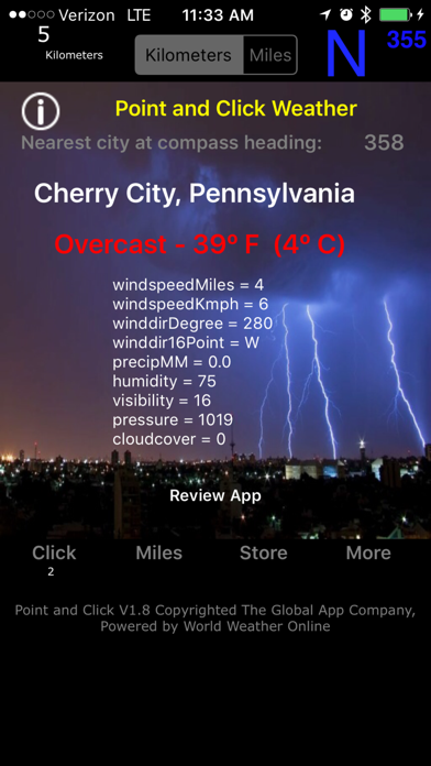 Using the compass function within the device, the App then identifies the name of the town or city that you are pointing at in addition to obtaining the weather from the closest reporting station for that location.