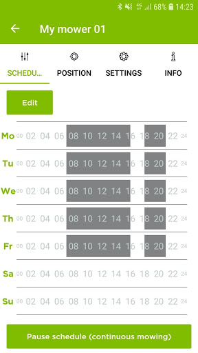 • View and edit mower settings like scheduling, starting points, and security functions