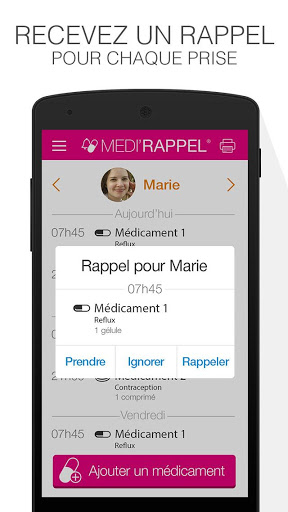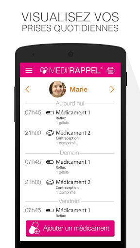 N’oubliez plus de prendre vos médicaments avec Médi’Rappel® ! Cette application santé pratique et gratuite est un moyen simple pour bien aider à suivre vos traitements et ceux de votre famille. L’Application Médi’Rappel est utilisable sur les terminaux disposant d'un système d'exploitation compatible comme stipulé sur les plateformes de téléchargement. Elle n'est pas conçue pour être utilisée pour tous types de traitements. En cas de doute, demandez conseil à un professionnel de santé.