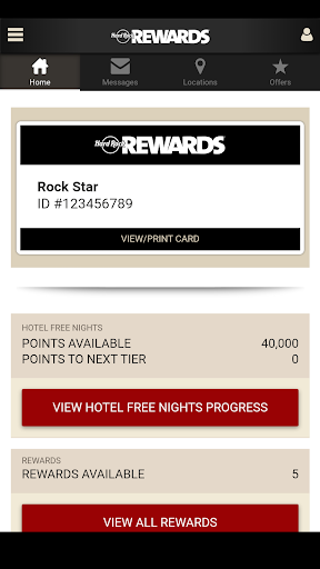 Being a Rock Star has its privileges. With Hard Rock Rewards, you can enjoy offers at nearly 200 participating Hard Rock® Cafes and Rock Shops, and earn points towards Free Nights at participating Hotels around the world. Simply provide your Rewards ID every time you visit a Hard Rock location.