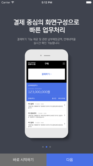 - 결제하기 기능 및 납부예정금액, 연체내역 등 업무에 필요한 정보를 실시간으로 확인할 수 있습니다.