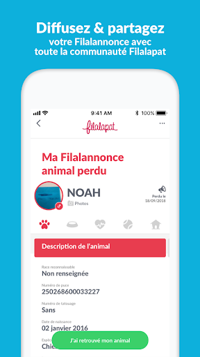 Filalapat est l‘application officielle dédiée aux animaux vus/perdus/trouvés en France.