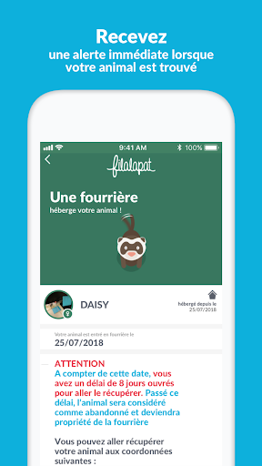 Une notification vous permet d’être directement mis(e ) en contact avec la personne qui a trouvé votre animal ou de recevoir les coordonnées de la Fourrière où il a été placé.
