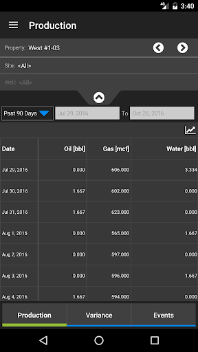 IHS FieldDIRECT® users can view their production from the project, site, and well levels in a table or chart view. The production and various data sets related to production can be graphed on a linear or log scale. Variance can be calculated at all levels based on user set timeframes. Downtime records and Equipment Failure records can also be viewed at all levels. The app allows IHS FieldDIRECT® users to view the pertinent production information regarding certain wells or areas at their fingertips from anywhere they have cellular data coverage or access to WiFi.