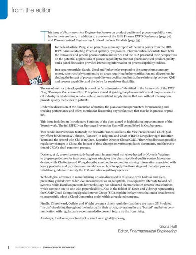Pharmaceutical Engineering features content on the latest scientific and technical developments, regulatory initiatives and innovative solutions to real-life problems and challenges through practical application articles and case studies. Technical articles will demonstrate global best practices in engineering and design; product development; technology transfer; manufacturing process development and scale-up; commercial manufacturing; quality and compliance; and product lifecycle management.