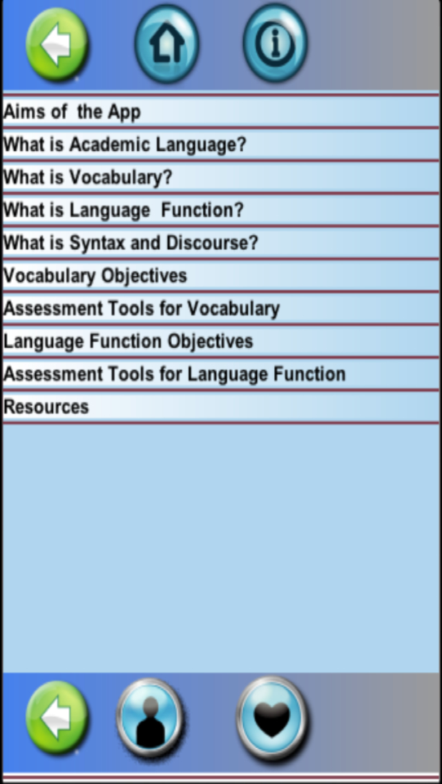 The aim of the Academic Language App is to define Academic Language, Vocabulary, Language Function, Syntax and Discourse. Examples of Objectives and Assessment Tools are shown.