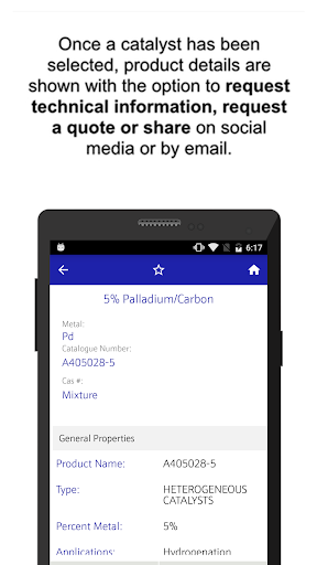 Once a catalyst has been selected, product details are shown with the option to request technical information, request a quote or share on social media or by email.