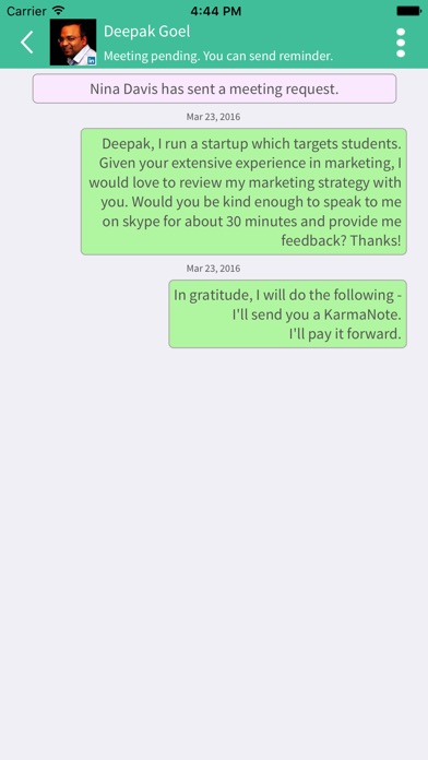 Privacy - The messages that you send to a KarmaGiver requesting a KarmaMeeting is visible only to two of you. The responses that you receive from the KarmaGiver are visible only to two of you. The KarmaNote that you send to a KarmaGiver is visible on your profile as well as the KarmaGiver’s profile. You can always hide it from your profile at any point of time.