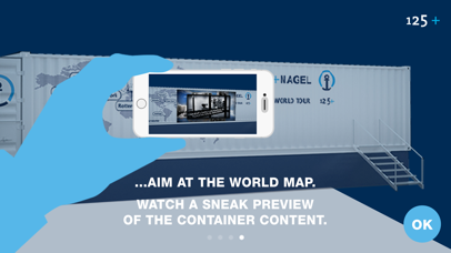 The KN 125+ app allows visitors to experience the Container Anniversary World Tour in a completely novel way. Look through the camera modus of the app at the Anniversary World Tour Container and the container becomes a movie screen. With the help of augmented reality, a selection of films about one of the world's leading logistics companies Kuehne + Nagel - History, People and Careers, Service Portfolio and Innovation - can be watched as if they were projected onto the surface of the container.