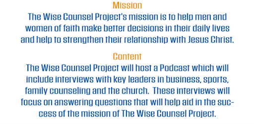 The Wise Counsel Project Podcast will include interviews with key leaders in business, sports, family counseling and the church. These interviews will focus on answering questions that will help aid in the success of the mission of The Wise Counsel Project.