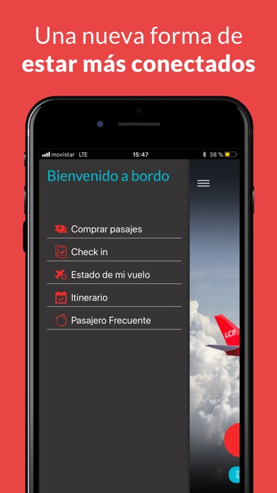 En nuestra app podrás cotizar y comprar tus pasajes de forma rápida y sencilla. Tendrás la opción de realizar check-in y escoger tus asientos. Podrás visualizar tu estado de vuelo, además serás parte de nuestro programa de acumulación de kilómetros "Pasajero Frecuente" y recibirás más nuestras últimas promociones y ofertas en la palma de tu mano.