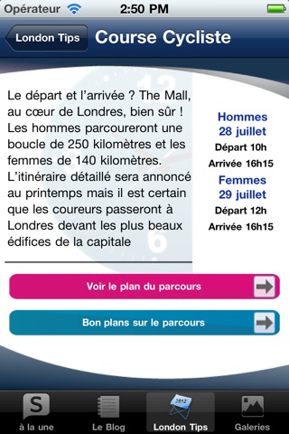 Sous l'onglet "tips", vous dénicherez tous les trucs et astuces pour profitez pleinement des charmes de la capitale britannique, ou des bons plans pour assister gratuitement à certaines compétitions-phares, comme le marathon ou le contre-la-montre en plein coeur de Londres.