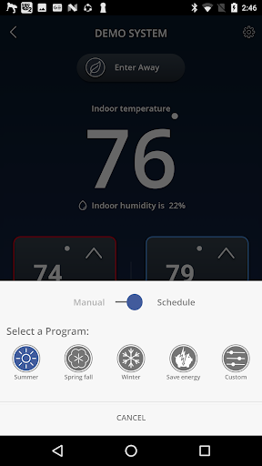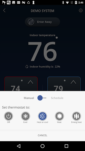 Leave the house and forget to dial back the thermostat? Simply start the app and use the one- touch away mode to save energy the entire time you are gone. Cancel the away mode before you get back to return to a perfectly comfortable home.