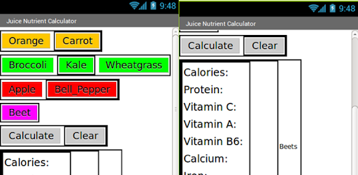 The Juice Nutrient Calculator calculates the exact calorie, protein, and nutrient content of your juice! Supports juices containg any mixtures of the following fruit and vegetable ingredients: