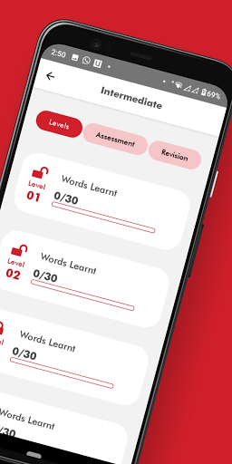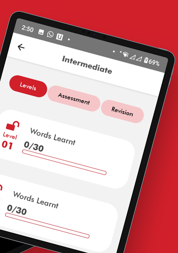 Further the categories have various levels and each level has a set of 25 to 30 words. You can therefore reach repeated milestones of learning a level of words within a day or two which would be an easily achievable learning target for you.