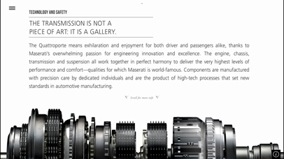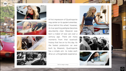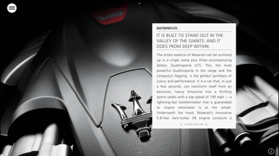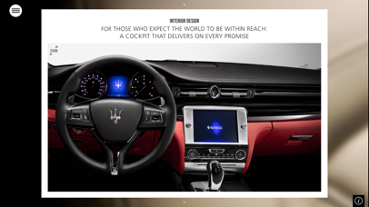 Step into the stunning, new Maserati Quattroporte in digital form, thanks to the new Maserati app. A sports sedan born of racetrack technology, the Quattroporte is a four door with a presence unlike any other. This app takes you on a touch-based tour of its high performance features and impeccably crafted interior, detail by detail. The configurator allows you to cycle through a myriad of color offerings. The 360 tour of Quattroporte provides a high-resolution tour of a most dynamic luxury sedan. Download from iTunes to start your Quattroporte journey.