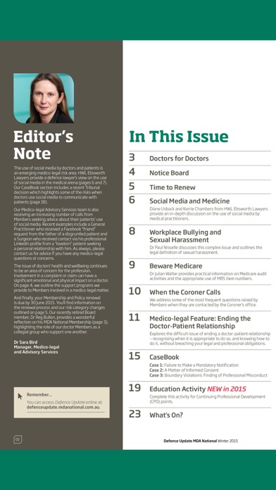 Inside each issue you will find articles designed to inform and generate discussion that will keep MDA National members at the leading edge of medical defence. As always our goal is to support, protect and promote our Members.