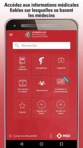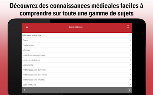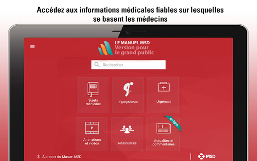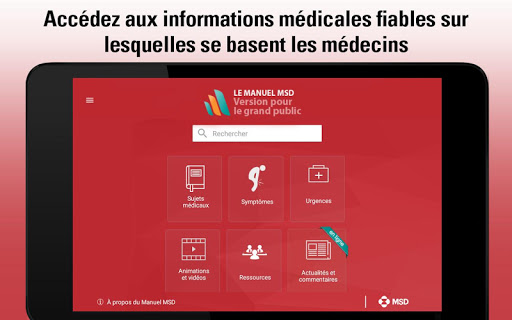 La connaissance médicale, c’est le pouvoir. L’app Le Manuel MSD, version pour le grand public propose des informations claires et pratiques sur des milliers de pathologies, y compris leurs symptômes et ce que font les médecins pour diagnostiquer et traiter ces pathologies.