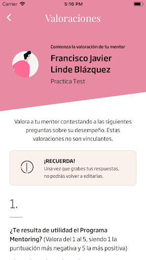 Bienvenido al Programa Mentoring! En esta app podrás valorar a tu mentor/mentorado y aportar sugerencias al Programa Mentoring. También solicitar cambio de mentor si fuera necesario. Vuestro feedback nos ayudará a mejorar la iniciativa.