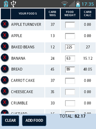 This simple carb calculator tool is useful for diabetics who use carb counting to manage their insulin use. If you carb count and also weigh your food to get an accurate carb value this app may be useful to you. It enables you to build your own list of foods and specify a carb value for each food item. You can then simply weigh a given food and input the weight into the app to get the carbohydrate value for that portion of food. All in-putted values are added to a total so you can easily calculate your carbs value for a complete meal.