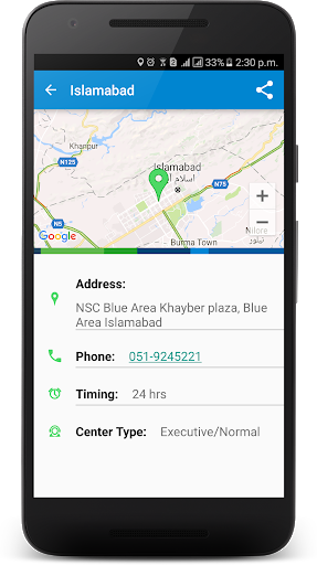 · Locates the nearest NADRA’s office/center and displays its complete details including address, operating hours, center type(ordinary/executive);
