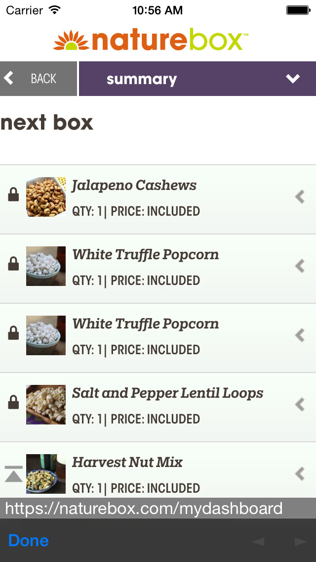 NatureBox delivers wholesome, crave-worthy snacks right to your door every month. NatureBox subscribers can customize each box, choosing from our ever-evolving catalog of more than 100 snacks. And now you can track your monthly NatureBox deliveries right from your phone!