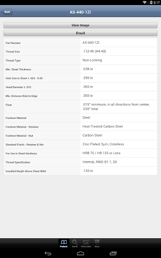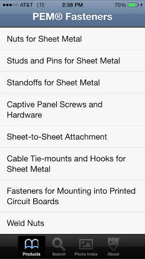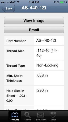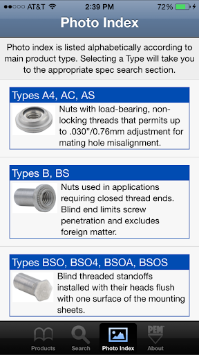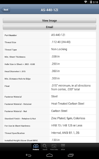 The desired fastener can be located by navigating quickly through the family type categories, photos or by direct part number search. The data returned includes mounting hole size, minimum sheet thickness, head height above sheet, photo view capability and much more.