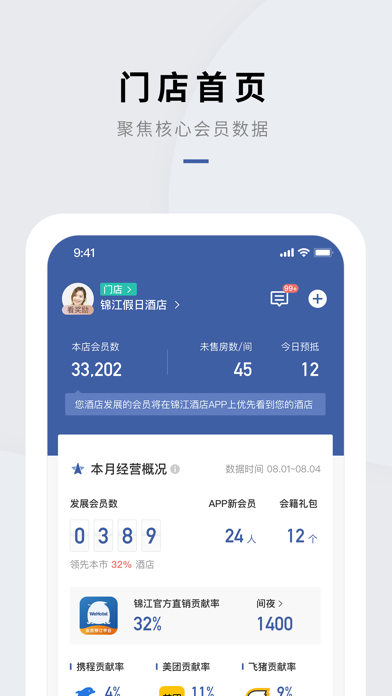 会员通App是锦江WeHotel推出的一款以会员经营为核心的酒店运营管理移动应用产品,旨在为锦江集团旗下酒店提供一种随时随地、方便快捷的酒店后台管理工具。WeHotel会员通利用大数据、智能分析挖掘技术,打通酒店业务闭环,以会员经营为核心,融合先进的营销理念,提升酒店营销水平,为酒店经营管理赋能。