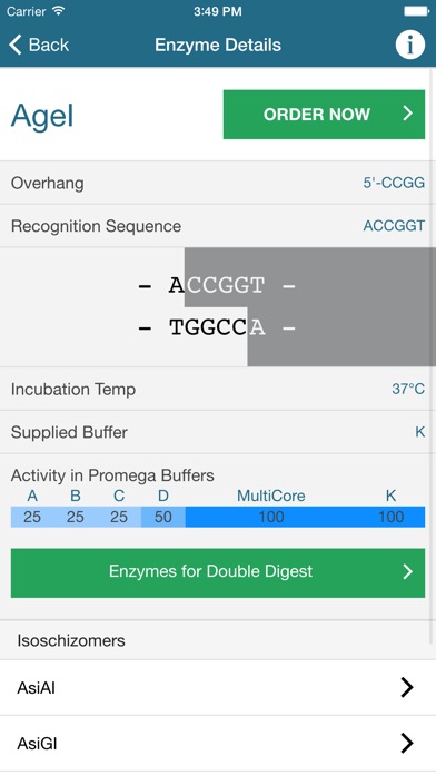 - View detailed information, including recognition sequence, overhang, incubation temperature and percent activity in Promega buffers
