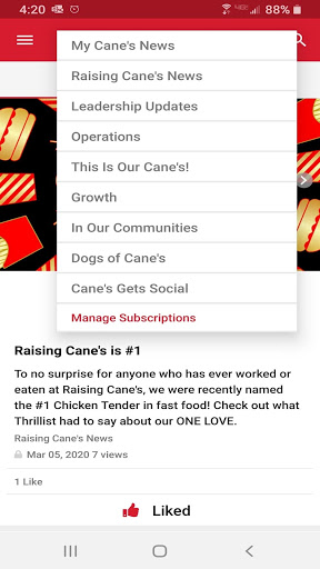The Raising Cane’s 1LV Crew App is your one-stop-shop for Cane’s info! Check out the latest and greatest news, photos and videos from across the Company. Get breaking news, hear the latest from Todd Graves, and more.