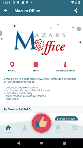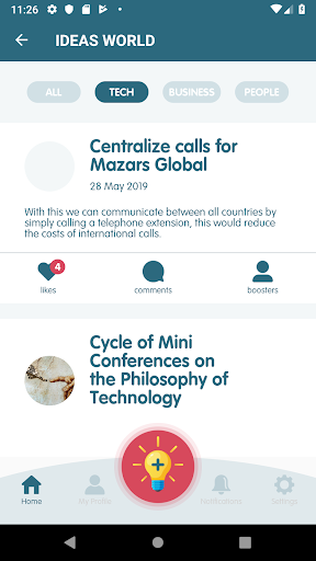 - Submit an idea: select your post reach, describe your idea, attach a picture, choose a tag (Tech, Business, People) and the business line, then submit