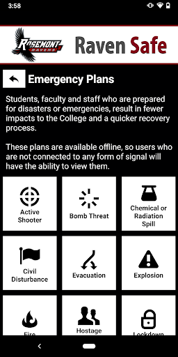 - Emergency Plans: Campus emergency documentation that can prepare you for disasters or emergencies. This can be accessed even when users aren’t connected to Wi-Fi or cellular data.