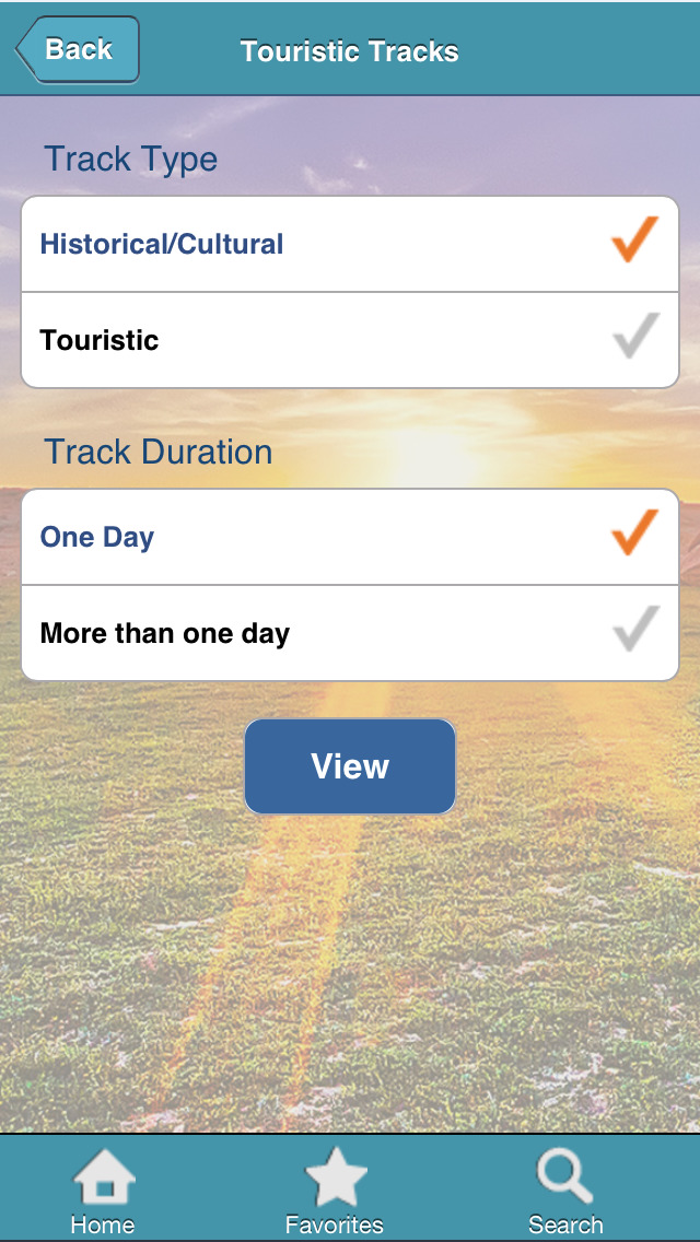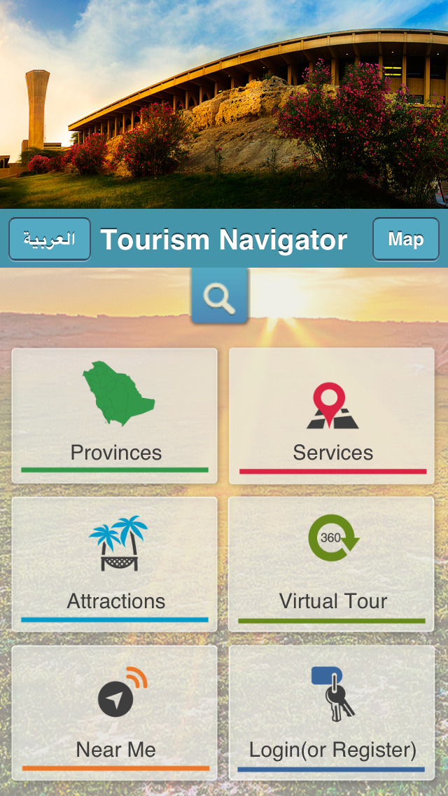 The "Tourism Navigator" app provides tourism information about the Kingdom of Saudi Arabia and displays them spatially. The application provides Geographic Information System (GIS) functions that allow you to search for tourism services and show the nearest service to you, search for roads, and tourism sites and displays virtual tours, and find the path with the driving directions between two points on the map. The application has bilingual interface (Arabic & English). The device should be connected to the internet and “Location Services” function should be turned on.