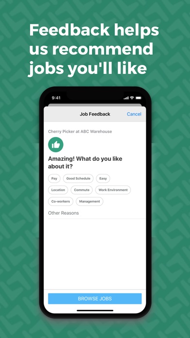 - Give feedback about your job so the app can make better suggestions based on the type of work you like!