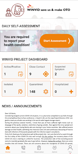 This app is a main means for communication between the operators and the workers at SK E&C Fujairah, UAE. Users are able to find news and announcements from the operation team as well as communicate their concerns and opinions with others. Users can also report compliance issues related to hygiene and social distancing.