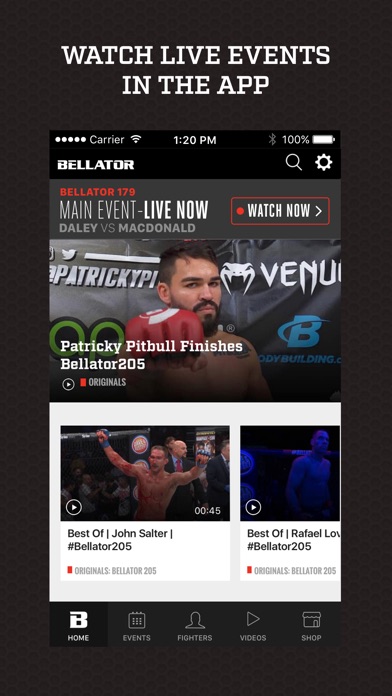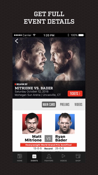 Experience the all new Bellator MMA Global app. The ultimate destination for MMA fans, the app is your home for LIVE fights, fighter stats, event and ticket info and more. The official app of Bellator MMA lets you stay connected wherever you go and provides exclusive access beyond the cage!