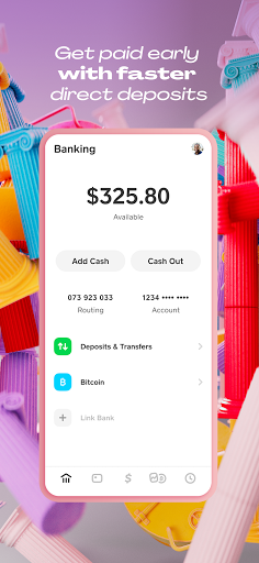 Deposit paychecks, tax returns, unemployment benefits, government stimulus payouts and more directly into your Cash App balance using your account and routing number. Receive deposits up to two days earlier than is standard with most other banks. Use the same account and routing information to pay bills using your Cash App balance.