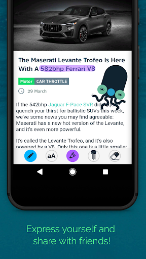 Personalise your favourite articles and share them with your friends. Press on the SQUID icon at the bottom of the screen and choose among our creative tools to add your personal touch to the article. Underline, draw or write something to express yourself, or add one of our cute SQUID stickers to tell the world how you feel about the article or the video you are sharing.