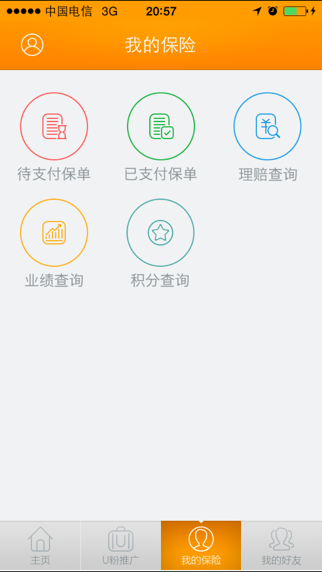 2、我的保险 待支付、已支付保单查询、理赔进度查询、业绩查询、积分查询
