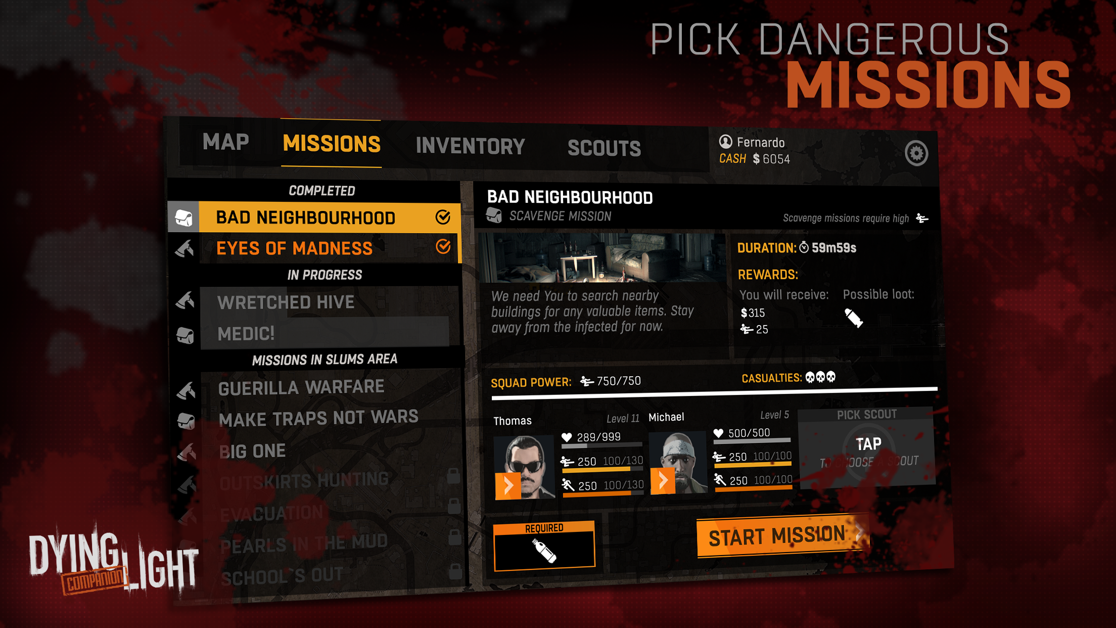 Companion for Dying Light is your free, one way ticket to Harran, the zombie infected city in which you managed to survive in. As a newly promoted scout commander, your role is to manage a team of Scouts - other survivors who are brave and swift enough to fight with the infected while gathering supplies and saving other survivors.
