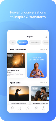 The Transform section of the app takes you deeper into your journey of personal growth and transformation. The Transform content is designed to introduce you to the powerful teachings of the leading Shift Network experts and world Luminaries. Exploring this section is the perfect way to learn more about the topics you’ve been curious about.