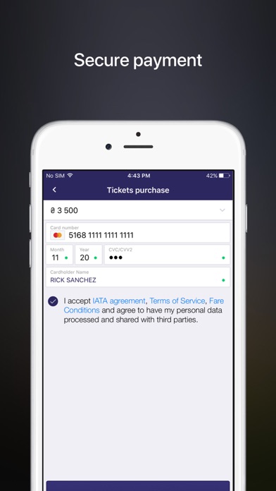 You can pay for the order with a credit card. Booking and payment of airline tickets via this application will take only 1 minute! It’s verified.