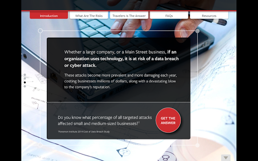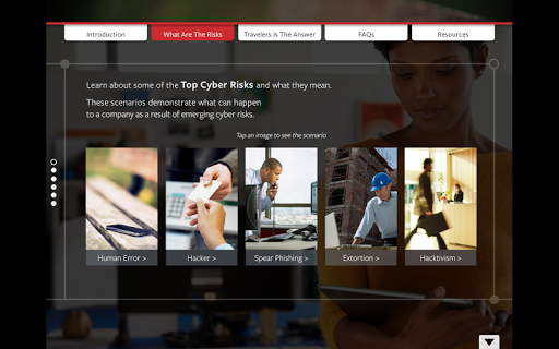 Cyber risks are constantly evolving and growing in complexity. The impacts on a business can be significant. Drawing from nearly 30 years of cyber risk expertise, the Travelers Cyber app is a tool designed to help you stay informed and to deepen conversations with your customers. Within the app you will find interactive content that provides education and tools to prepare your customers for this ever changing risk.