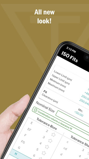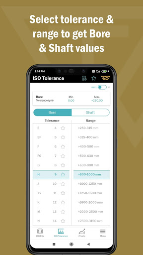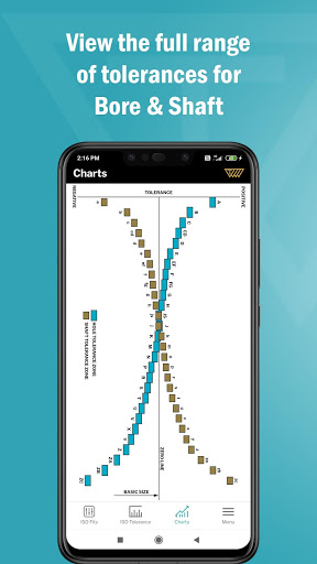 - Fits calculation: Upon entering the nominal diameter (of either bore or shaft), users select their tolerance classes for bore and shaft. The app then provides the complete ISO fits definition with all relevant values.