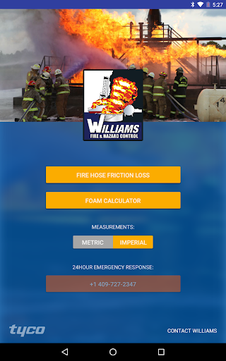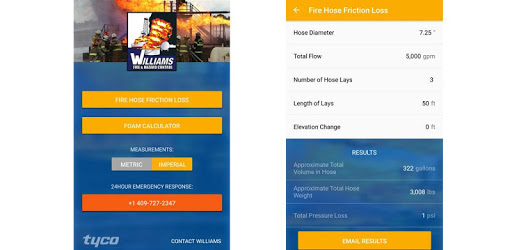 App provides educational, pre-planning and incident command tool for emergency management personnel to calculate real-time firefighting requirements (foam concentrate needs & hose friction loss measure) for crude storage terminals and tank farms. Connects user directly to Williams Emergency Response Team.