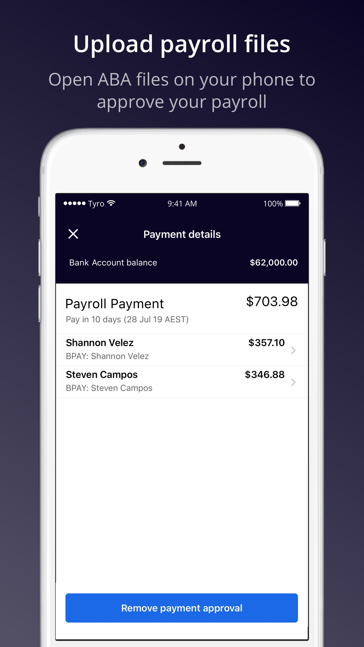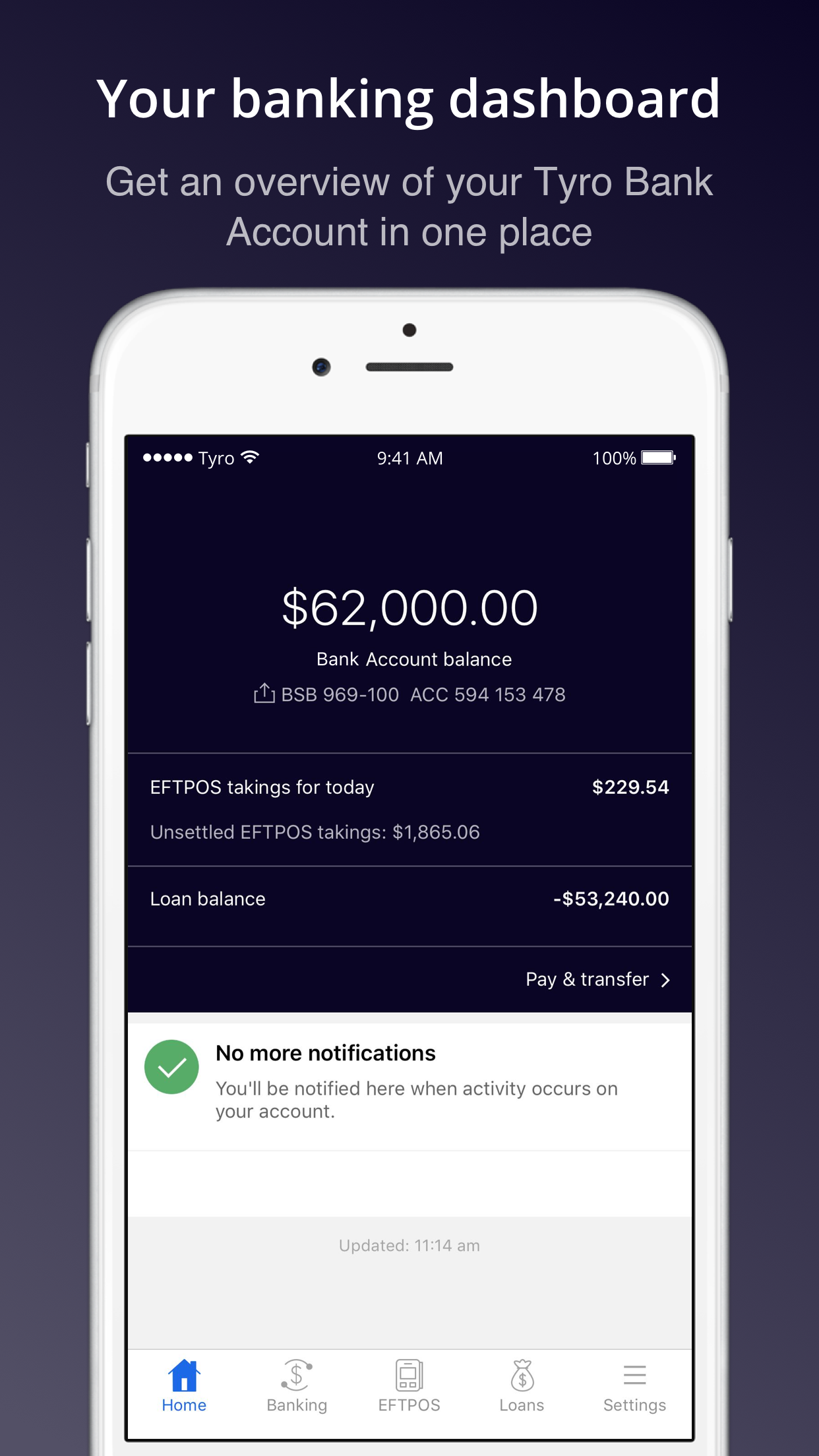 The Tyro App is compatible with iPhone operating iOS 11 or later. Bill notifications through Apple iOS are subject to network provider coverage. Transfers and payments can only be made to an account in Australia.
