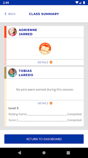 • Record player progress with the touch of a button when a skill is completed or attempted and when an achievement pin is earned